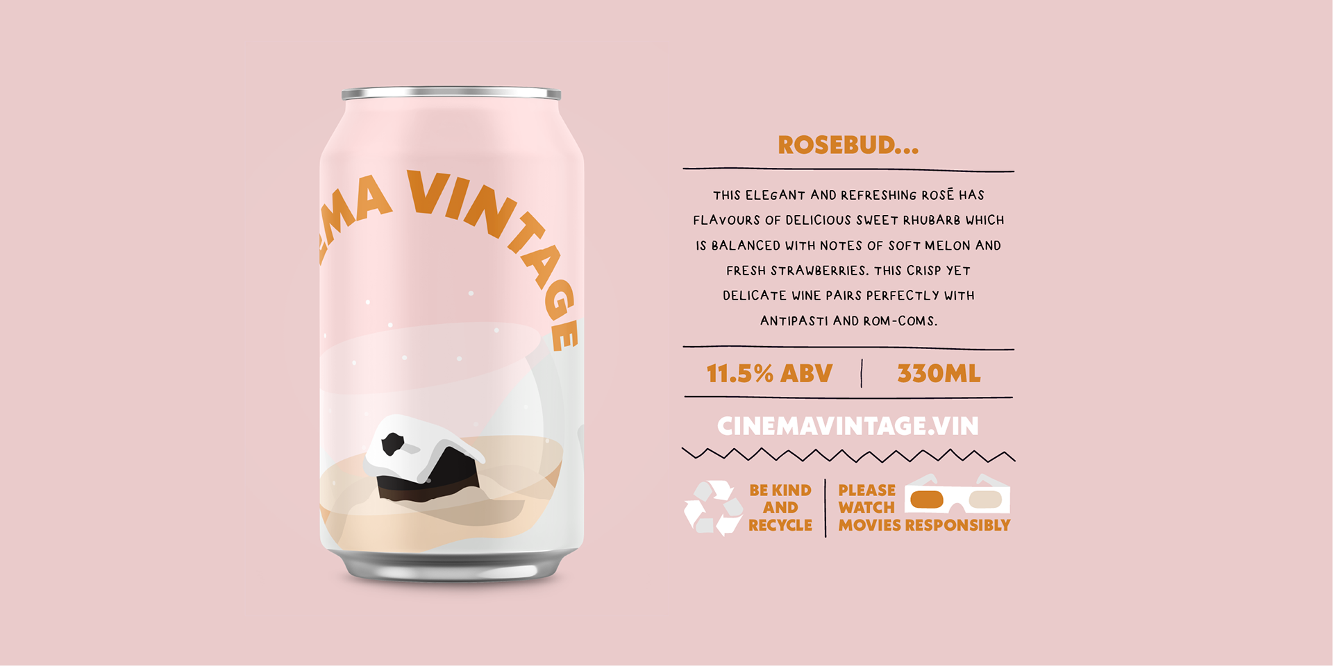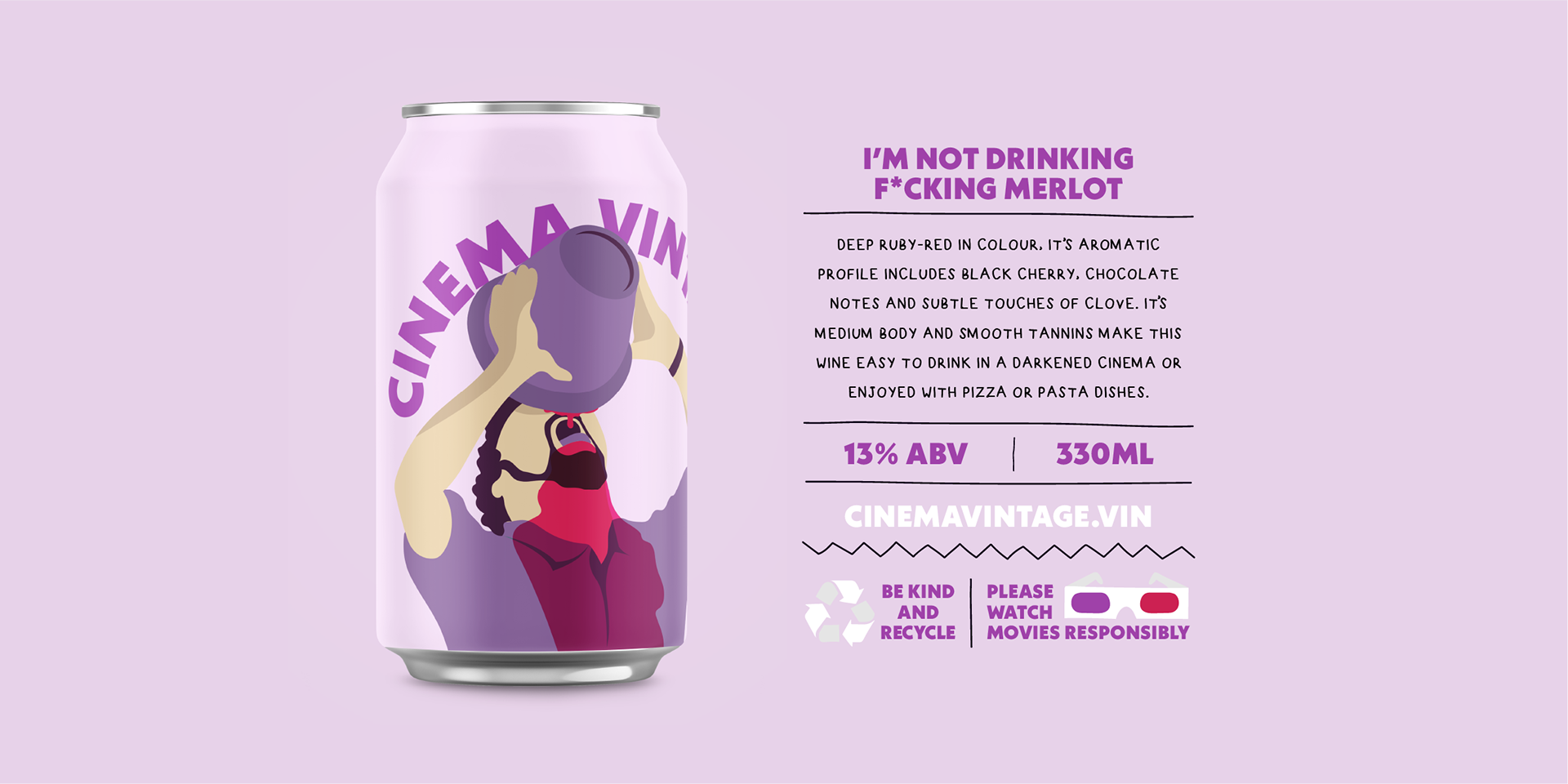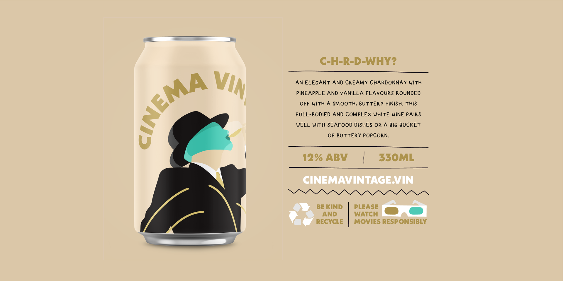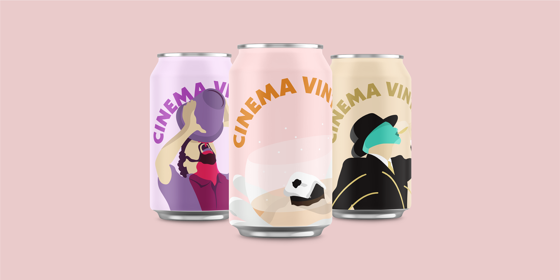 Brand, illustrations and packaging for Cinema Vintage - wine in a can, for movies.